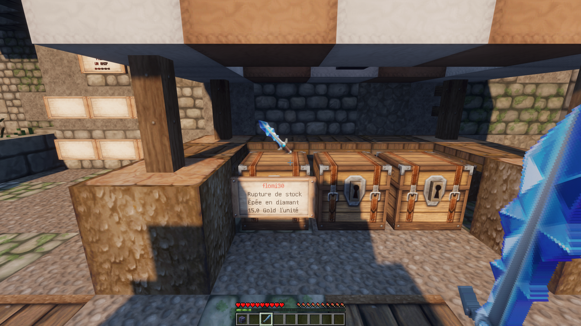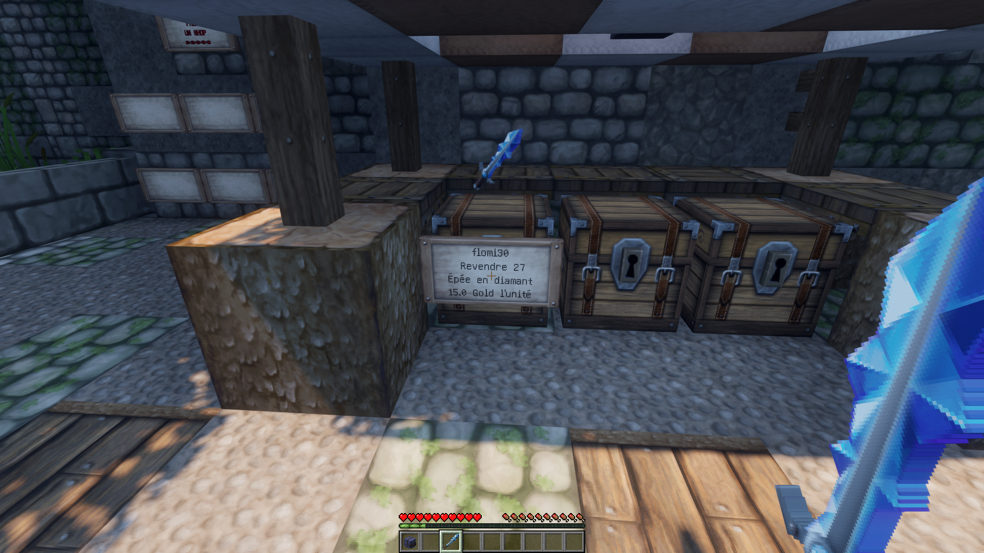 en visant le coffre et à l'aide de la commande /qs sell vous passerez en coffre de rachat, dans l'exemple ci dessous je rachète donc les épées en diamants $15,00